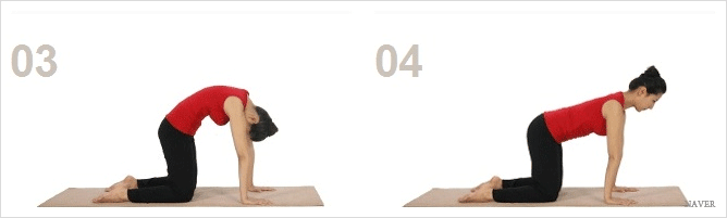 변비에 좋은 요가자세 중 잘 아시는 고양이 자세는 장의 기능을 도와주고 힙업에도 아주 좋은 자세인데요. 먼저 양쪽 무릎과 손바닥을 바닥에 대고 엎드려 주세요. 엎드린 자세에서 어깨 넓이로 벌려준 후에 등은 하늘을 향하게 끌어올려주시구요. 머리는 양팔 안쪽으로 넣어주면 고양이 자세가 된답니다. 반복운동을 하면 좋겠죠?
